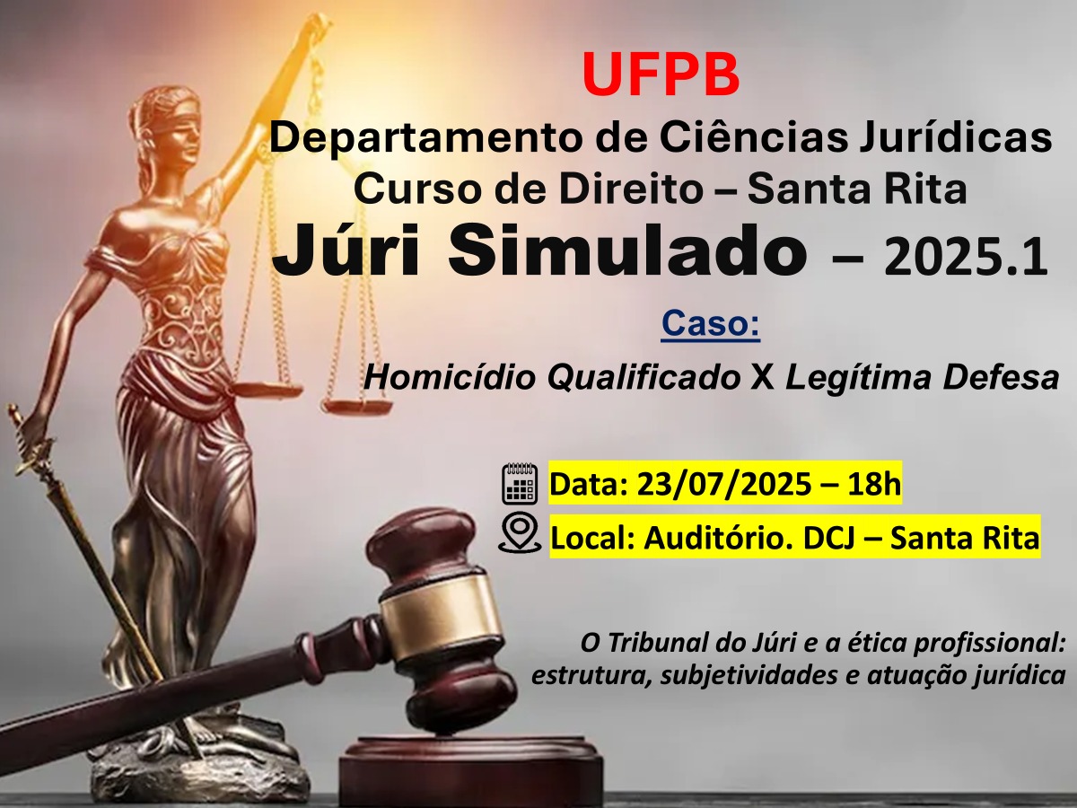 O Curso de Direito, do Departamento de Ciências Jurídicas da Universidade Federal da Paraíba, realizará no dia 23 de julho de 2025, às 18h, no Auditório, a Oficina Jurídica “Júri Sumulado e a Ética Profissional: Estrutura, Subjetividade e Atuação Jurídica”, desenvolvida por alunos alunas das Disciplinas de Direito Penal I, II e III e Ética Geral e Profissional.