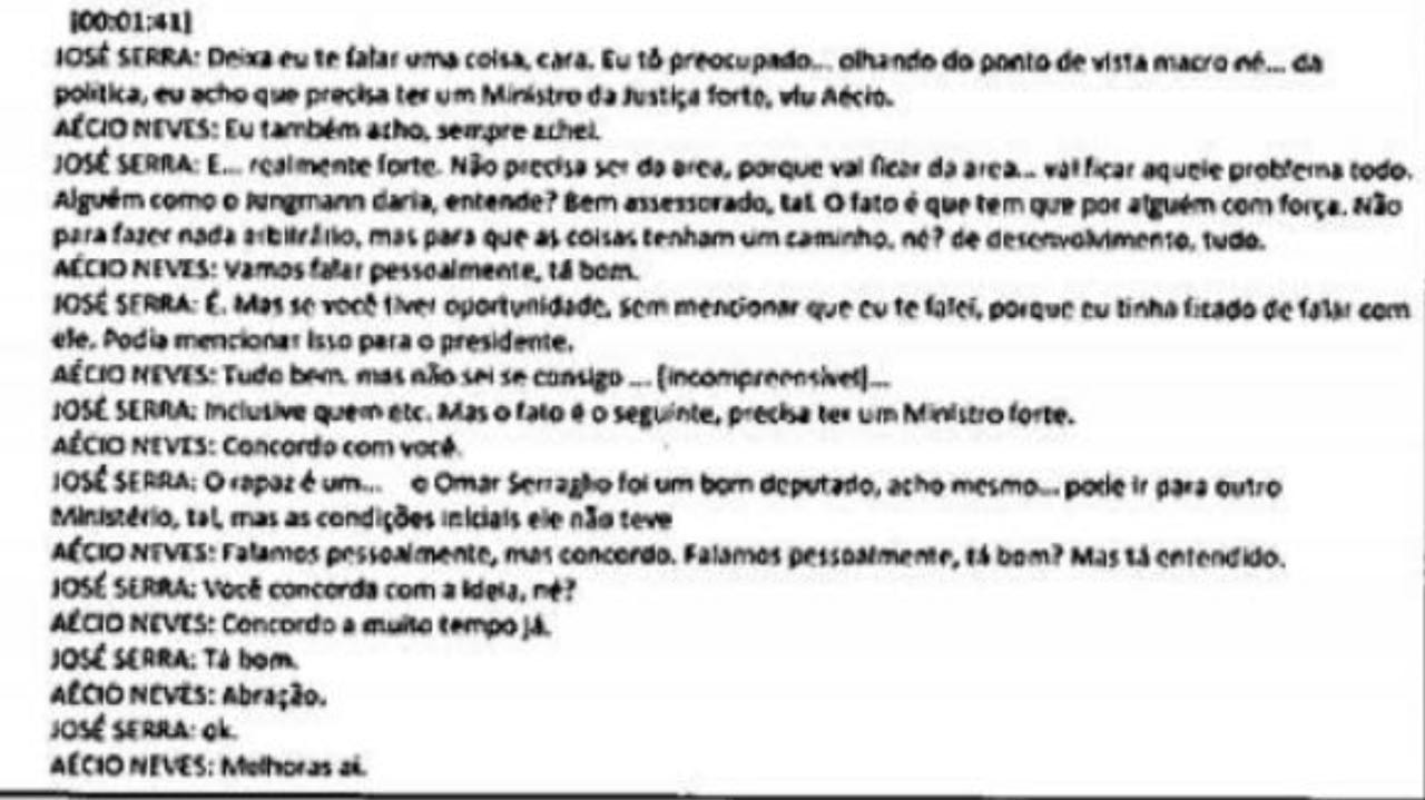 José Serra – Deixa eu te falar uma coisa, cara. Eu tô preocupado… olhando do ponto de vista macro, né… da política, eu acho que precisa ter um ministro da Justiça forte, viu Aécio.