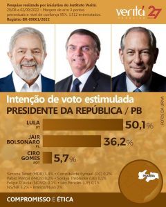O Instituto Veritá divulgou, nesta terça-feira (06), pesquisa de intenção de votos para a Presidência da República na Paraíba. Lula (PT) é o preferido do eleitorado com 50,1% das intenções de votos. Já o atual presidente, Jair Bolsonaro (PL), somou 36,2%, ficando em segundo lugar na preferência dos paraibanos.