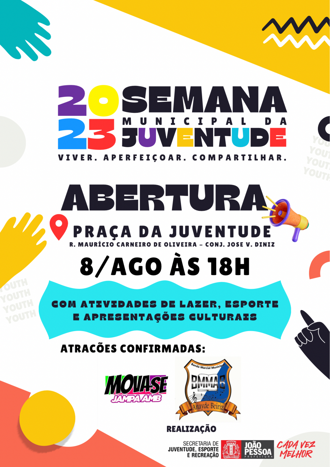 A Prefeitura de João Pessoa, através da Secretaria de Juventude, Esporte e Recreação (Sejer), começa a Semana Municipal da Juventude nesta terça-feira (8). Com o tema “Viver. Aperfeiçoar. Compartilhar”, o evento será aberto, às 18h, na Praça da Juventude, no bairro Vieira Diniz. O encerramento acontece na noite da sexta-feira (11), no ginásio Neuza Gonçalves Brandão, na Praça da Paz, nos Bancários.